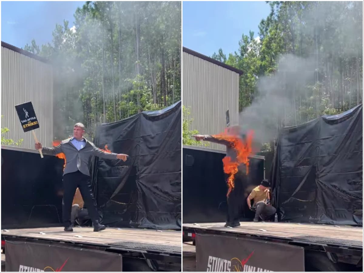 Harrison Ford’s stunt double for Indiana Jones sets himself on fire at SAG-AFTRA strike rally