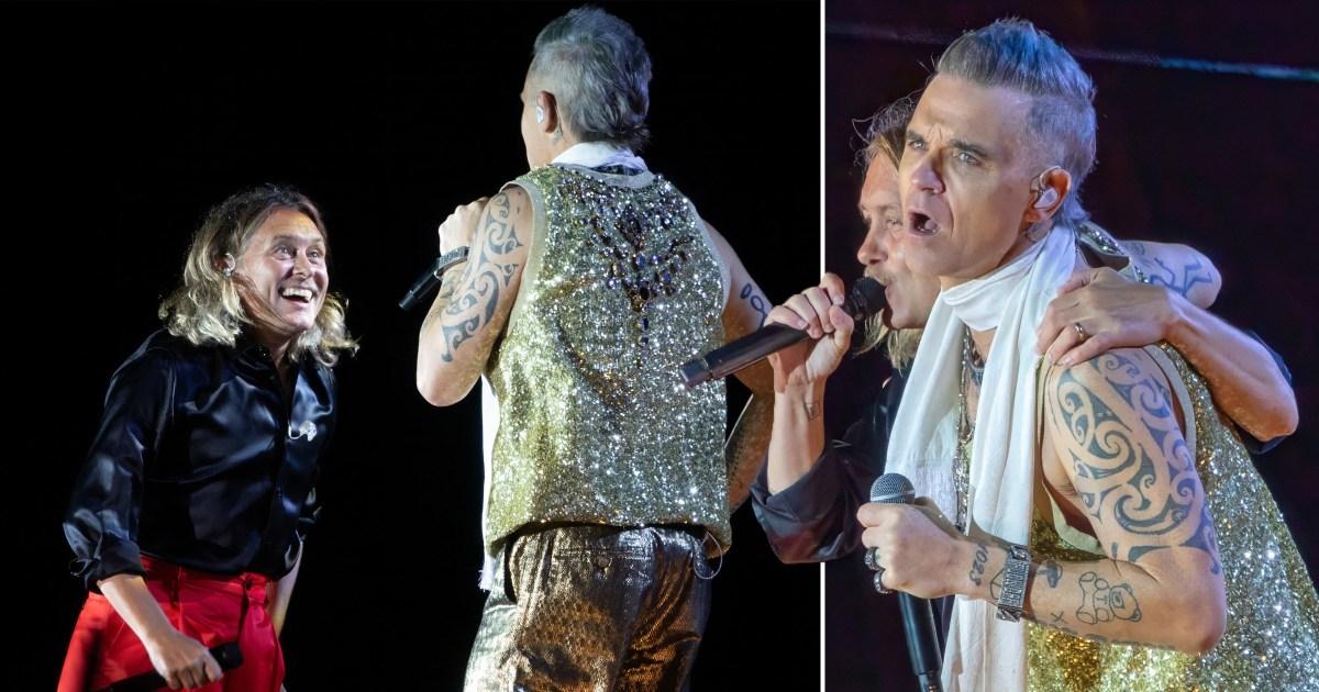 Robbie Williams thrilled fans when he reunited with his former Take That band member on stage for the first time in over a decade on Saturday.Â