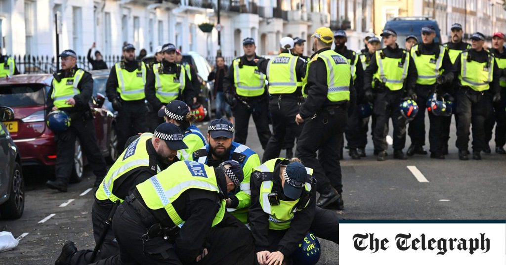 The group shouted “you’re a disgrace” and “you’re not English anymore” at police, also adding “we want our country back”.
