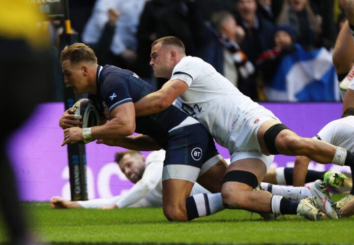 What an athlete he is! It’s another England error that creates the opportunity, George Ford’s pass slightly high for George Furbank, a flick of the fingers and into the face before rebounding into Scottish hands.