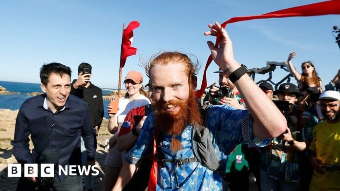 He arrived in Tunisia’s Ras Angela after running more than 10,000 miles (16,000 km) on a charity run that took him through 16 countries.